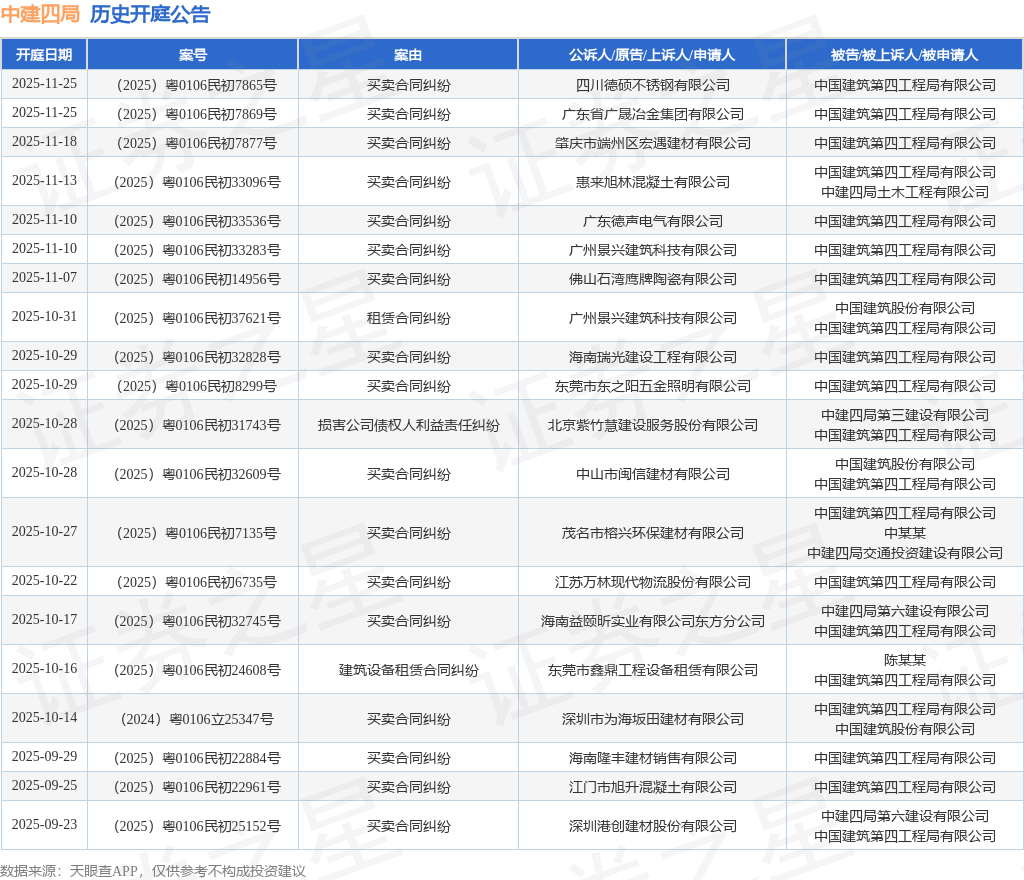 本站消息,根据天眼查APP显示,近日公布了一则中国建筑第四工程局有限公司作为被告/被上诉人的开庭公告,详细内容如下: